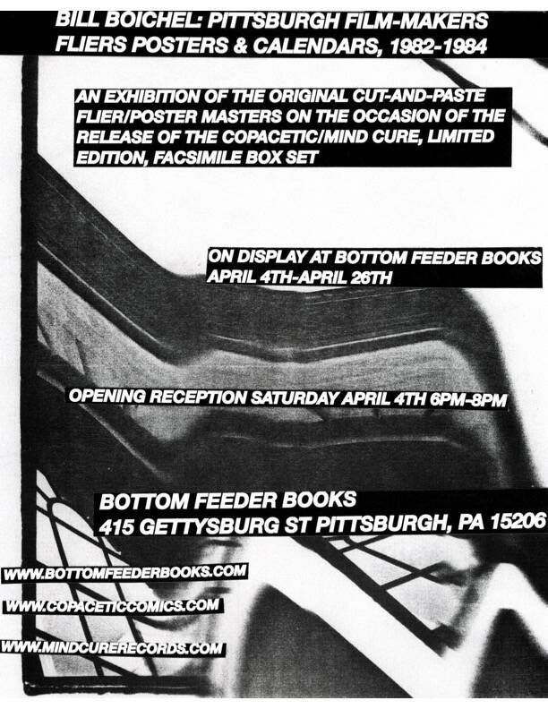 Believe it or not, Bottom Feeder Books will be hosting an exhibition of the original cut-and-paste masters for fliers, posters & calendars that Bill Boichel made for Pittsburgh Film-Makers during his tenure as the director of their film and video exhibitions program from 1982 to 1984. It opens THIS Saturday, April 4th – and there will be an opening reception / release party from 6 to 8pm. Naturally enough, Copacetic will be in the house.